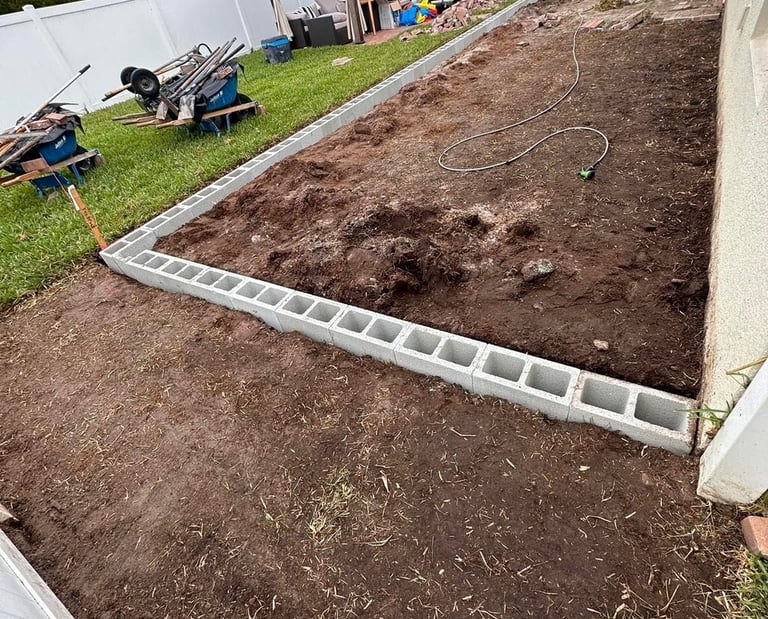 Installation of a concrete foundation or ground support for larger structures, such as retaining walls, benches, columns, decks, or stairs